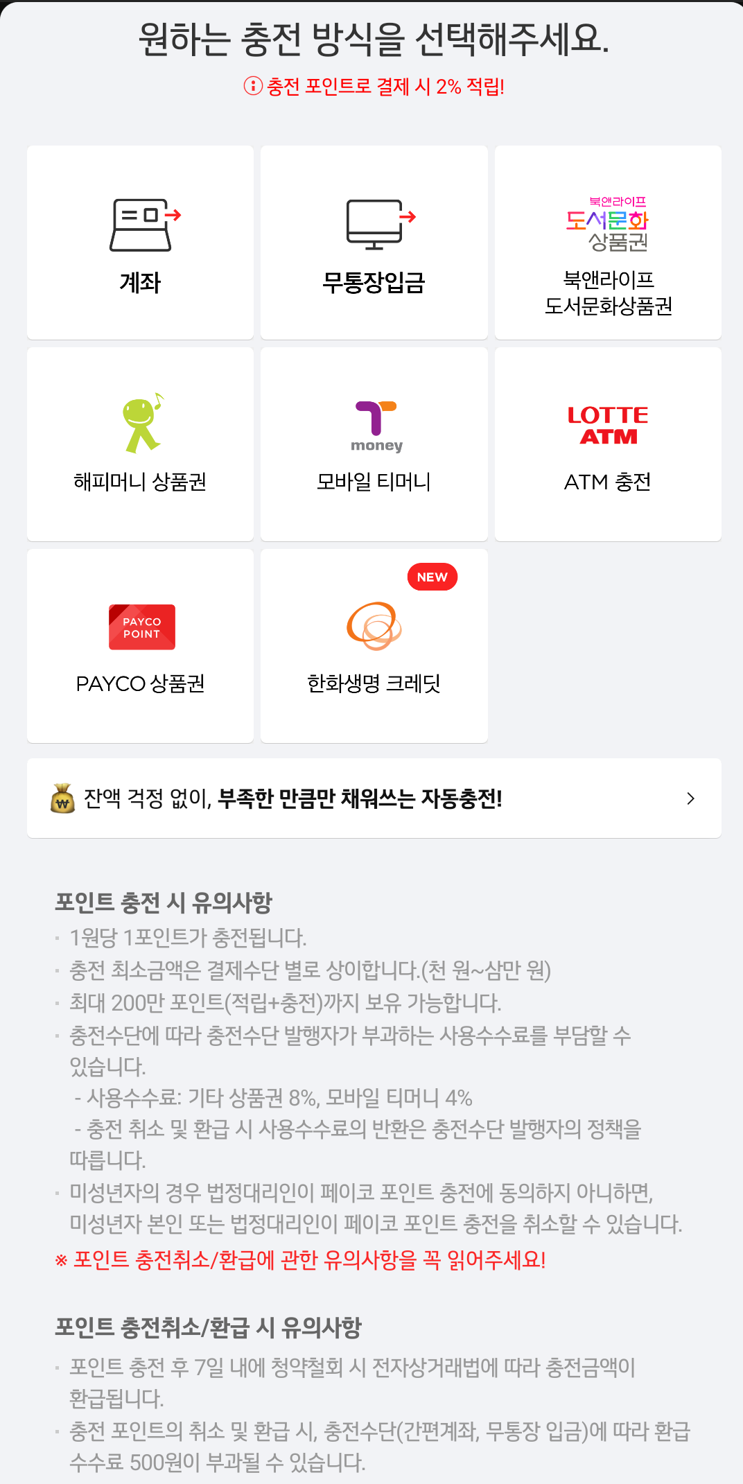 여기서 주의할 점은 상품권을 페이코포인트로 전환하거나 모바일팝에 충전할 경우 8%의 수수료가 부과됩니다. 따라서 상품권은 8%이상의 할인율이 적용된 것을 구매하여야 손해를 보지 않습니다.