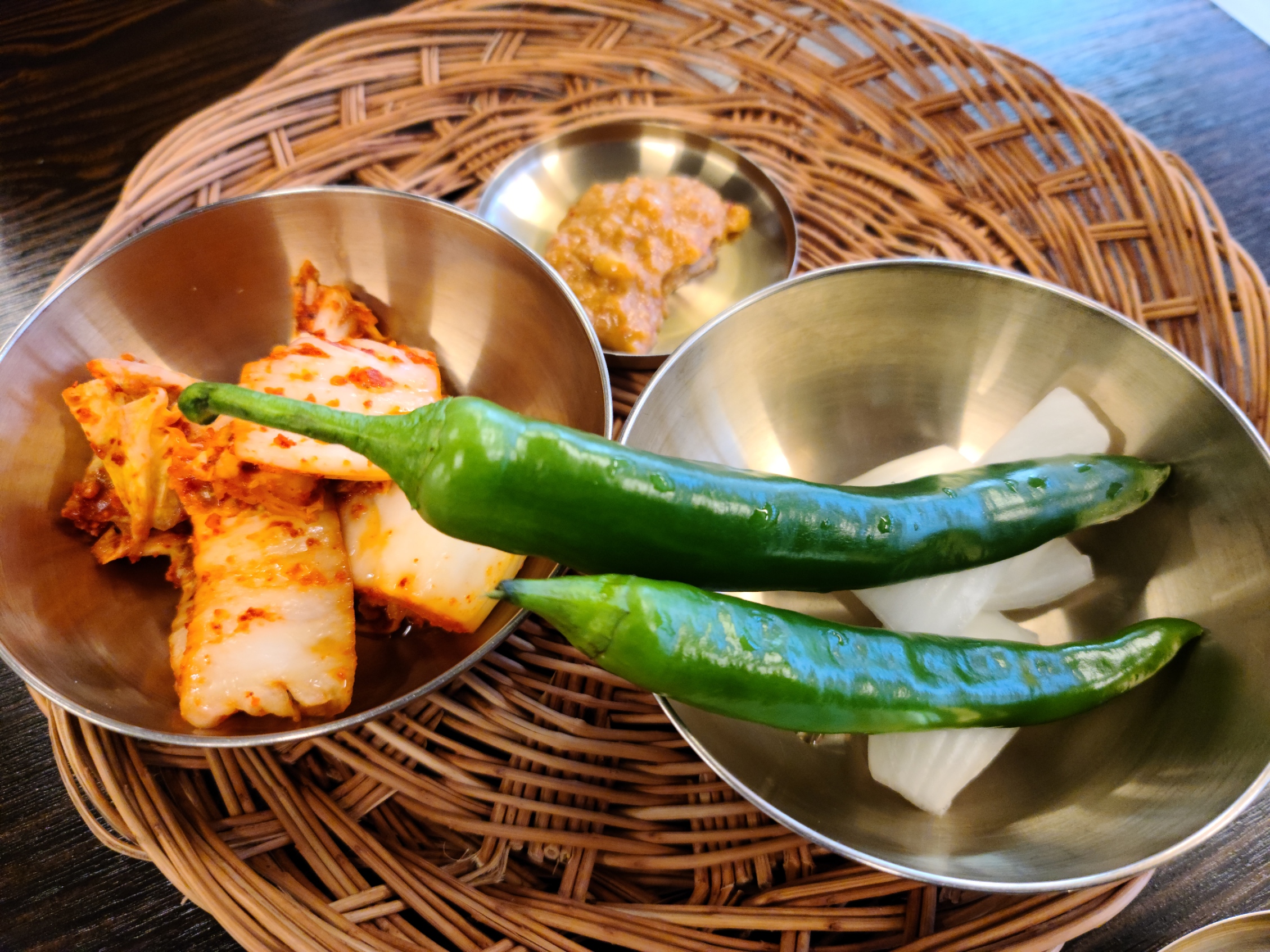 기본으로 나오는 반찬입니다. 고추, 양파, 김치, 쌈장 등이 함께 나옵니다.