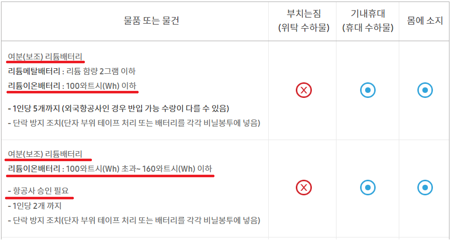 위 내용에도 불구하고 항공사마다 기준이 다를 수도 있습니다. 따라서 대용량 보조배터리를 가지고 갈 경우 기내 반입 여부가 확신이 서지 않는다면 해당 항공사에 문의를 하는 것이 좋습니다.추